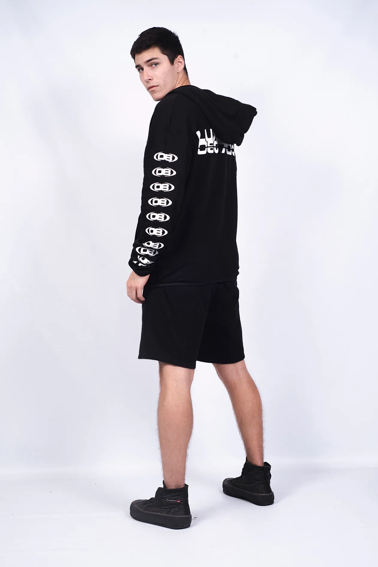 DETALLE DE ESTAMPA A CONTRA TONO CENTRALIZADA EN ESPALDA Y MANGAS Y ETIQUETA DE GOMA SOBRE RELIEVE CON LOGO DE MARCA AL FRENTE